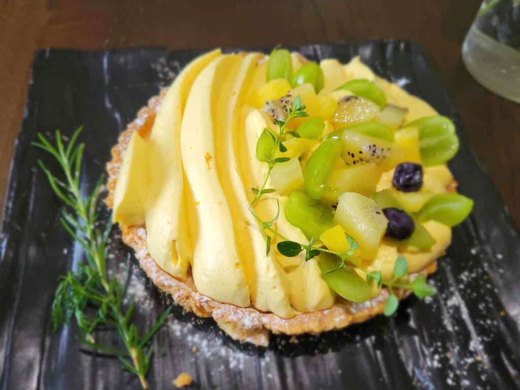 クリームチーズのアパレイユを流したタルトに、ルバーブのコンフィチュールをナッペし、マンゴーのクリーム、またはいちごのクリームで仕上げるタルトです。