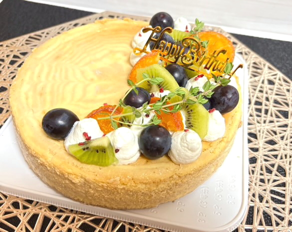 お誕生日にチーズケーキのご依頼を受けられたとのこと♪ 過去のハロウィンチーズケーキをアレンジして、コーヒーとホワイトチョコの生地で模様を描かれたそう。