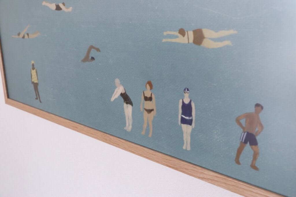 「SWIMMERS」という名前で、様々な肌の色の人たちが、思い思いに泳いでいる楽しい絵柄。