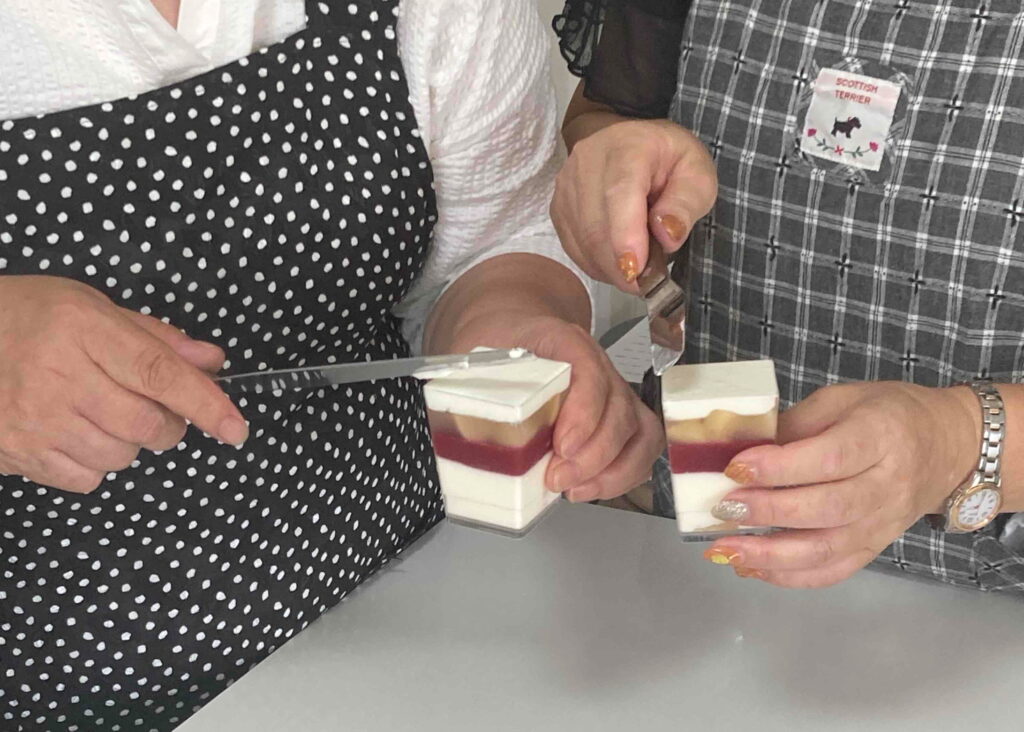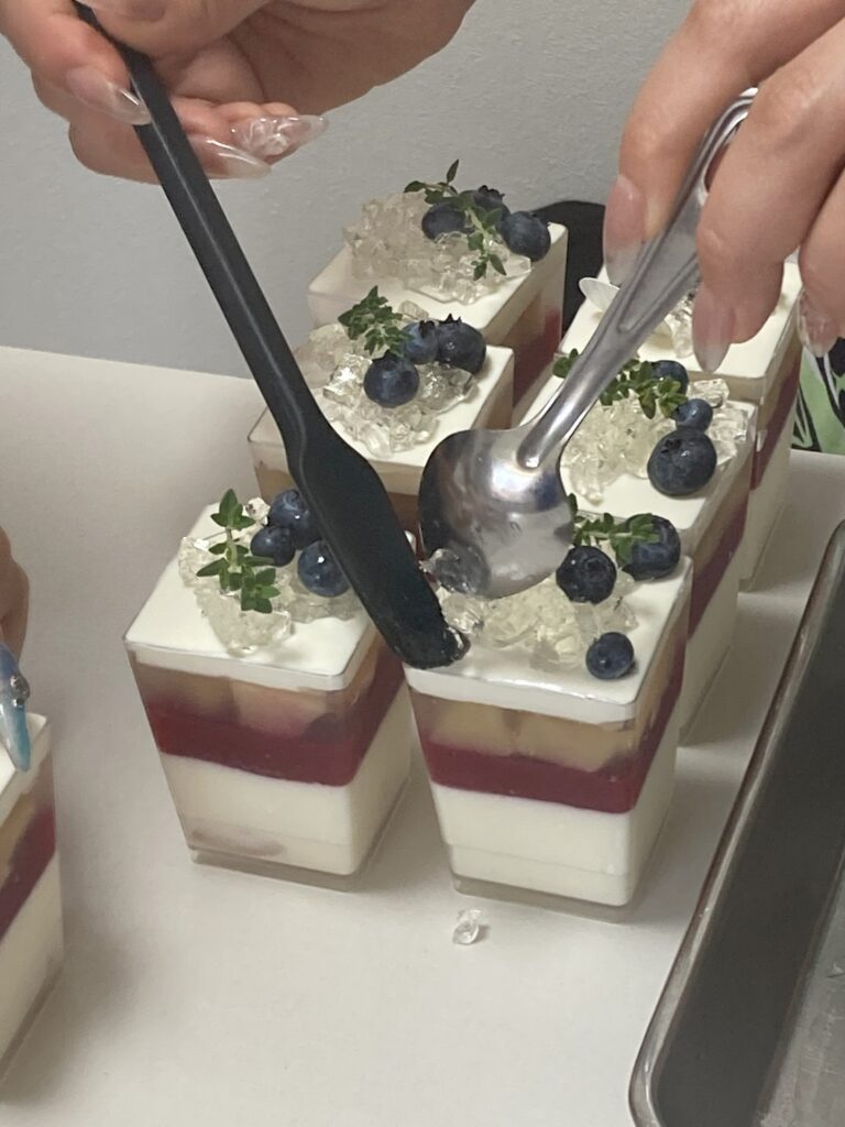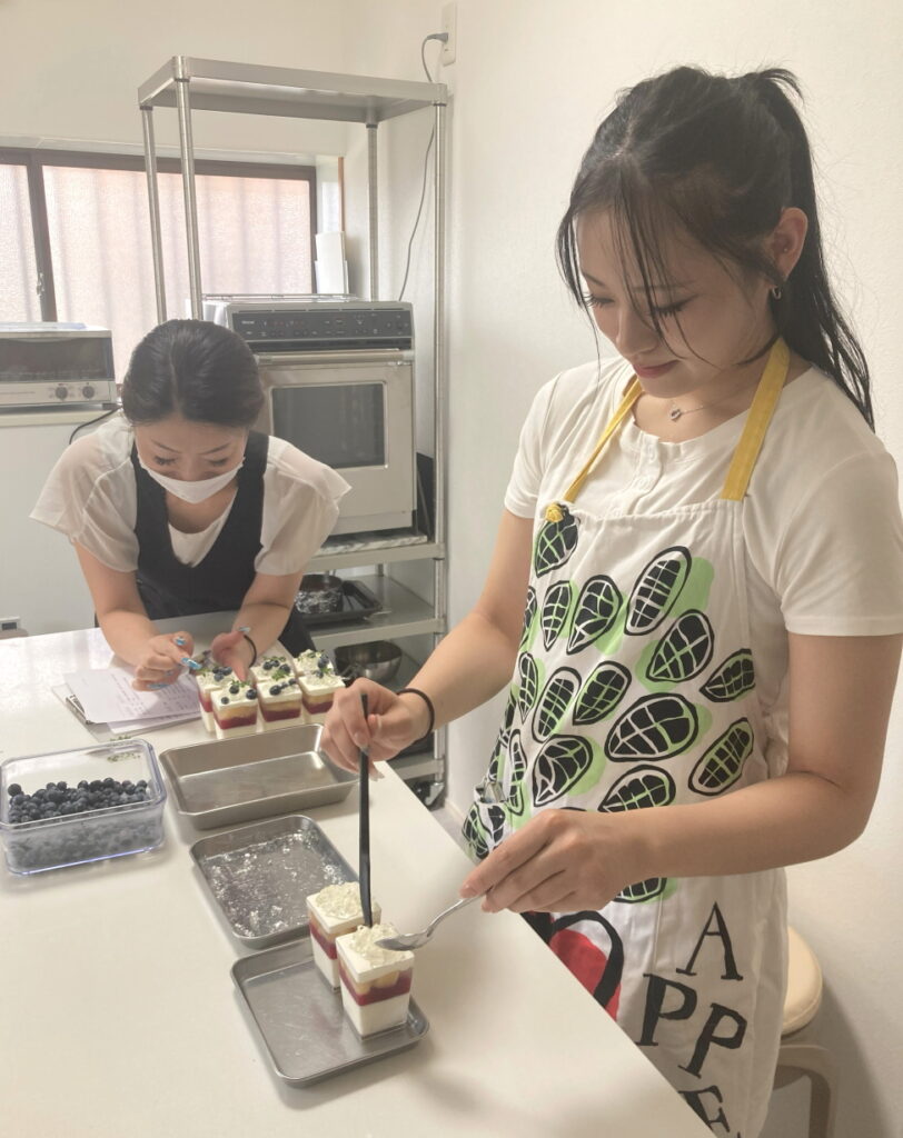 ↑ ヨーグルトクリームをカップにすり切りに入れていただいています。