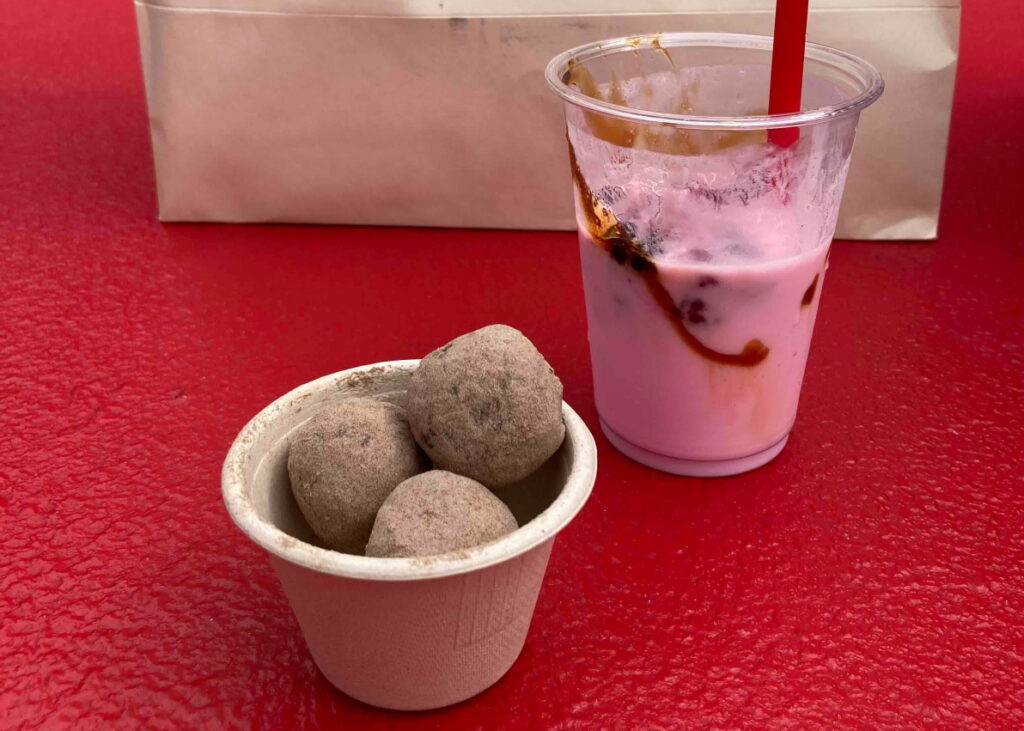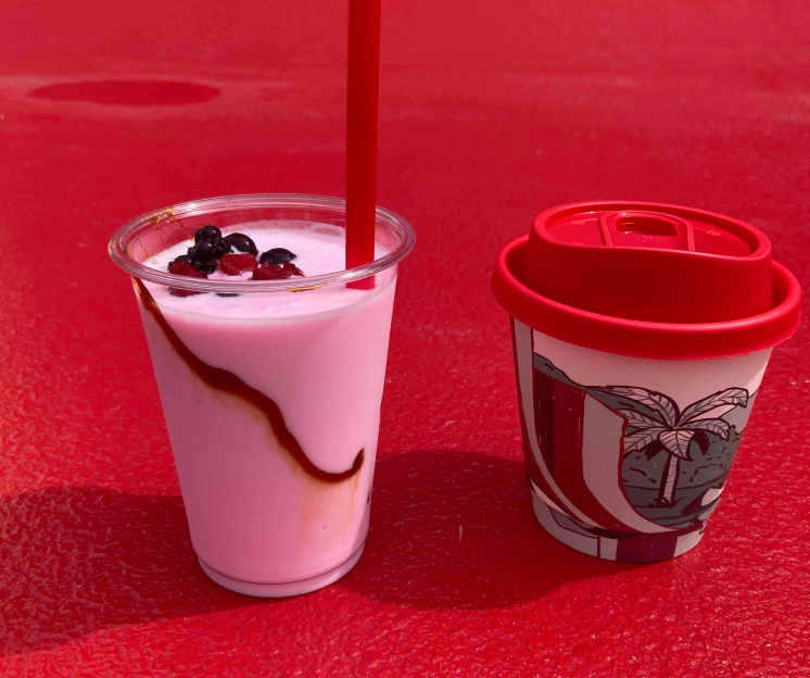 しっかり香りを確認したあとは、カルダモンが香るオマーンコーヒーと、ローズ、ヨーグルト、デーツシロップ入りのスムージーをオーダー。