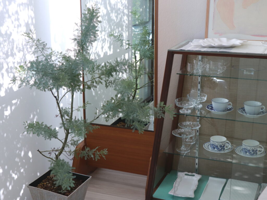 寒くなってきたので、ミモザの鉢植えもグリカフェに持ってきました。