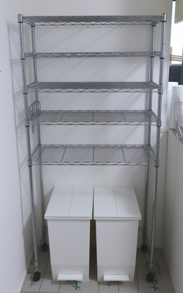 ゴミ箱上の収納用シェルフです。  ちなみに45リットル用のこのゴミ箱も、使い勝手が良さそう。