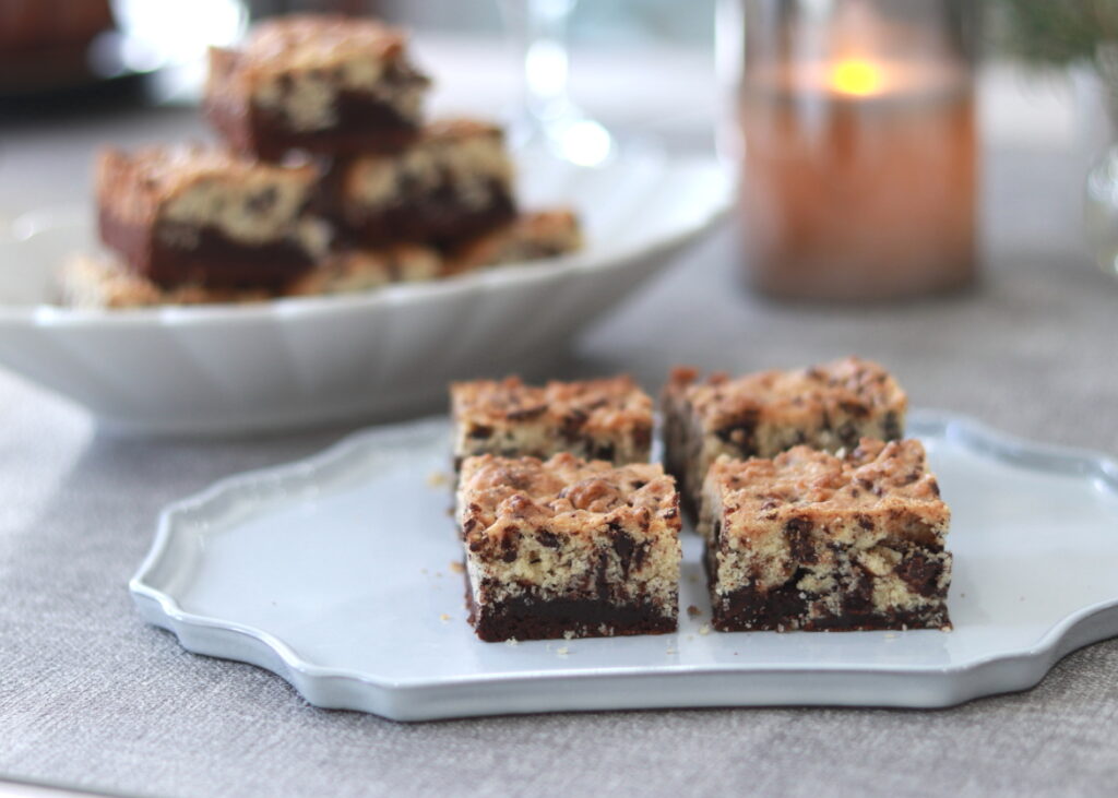下がブラウニーで上にチョコチップクッキー生地を乗せて同時に焼く、アメリカのお菓子。